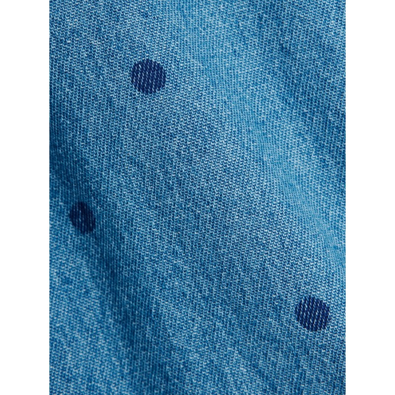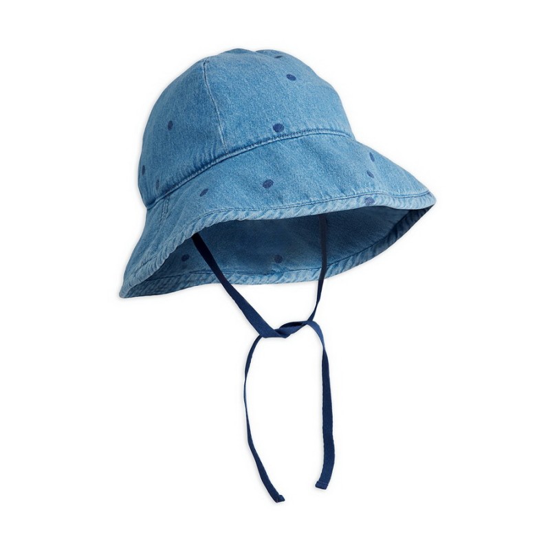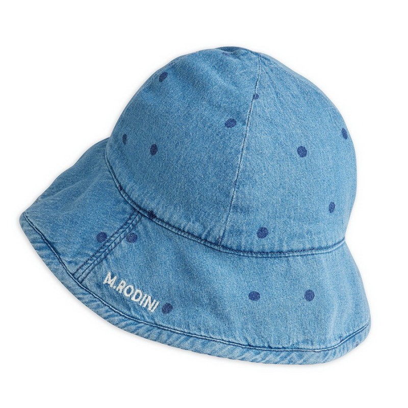 Solhatt i lätt denim med prickar, tillverkad av 100% ekologisk bomull.